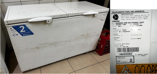 iv) 01 freezer horizontal Fricon, 503L, 127V, em funcionamento, estado regular. Avaliação: R$ 1.000,00