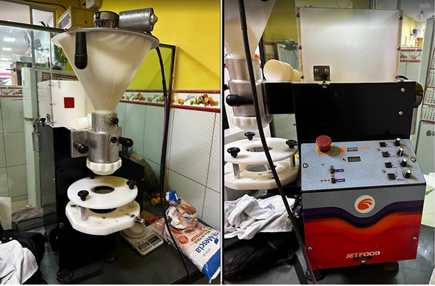 xi) 01 modeladora de salgados Jetfood Master, duplo recheio, marca Interlaser, 220V, funcionando, bom estado. Avaliação: R$ 8.000,00.