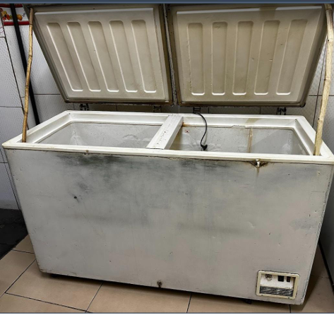 v) 01 freezer horizontal sem marca, 500L aprox., mau estado. Avaliação: R$ 500,00