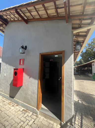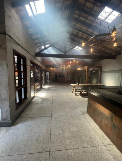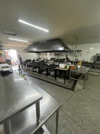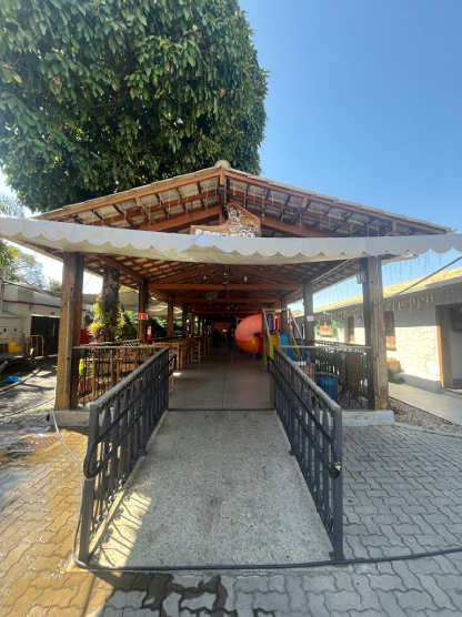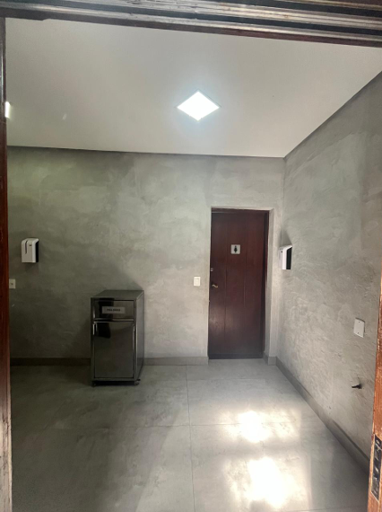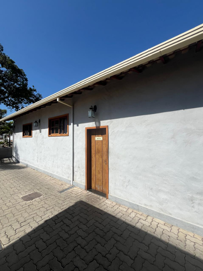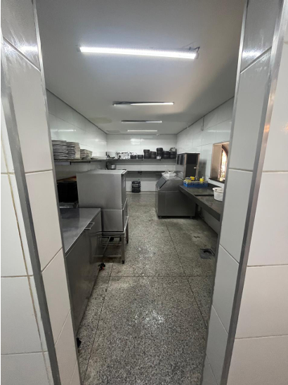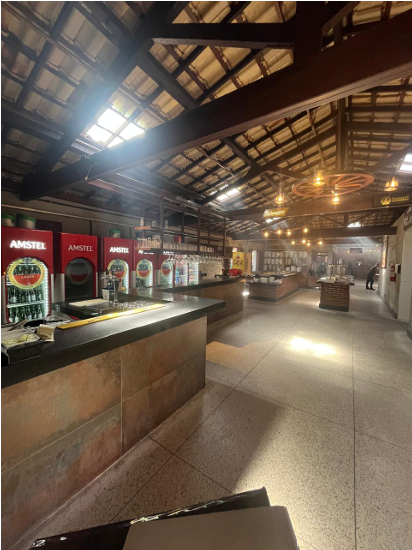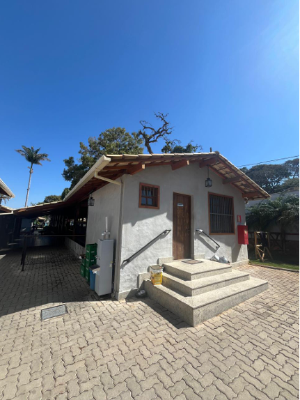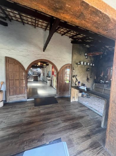 7) Casa principal, toda em alvenaria e telhado colonial: a) 01 (um) hall de entrada; b) 01 (um) salão com balcão em granito e 02 (dois) aparadores em alvenaria; c) 01 (uma) cozinha grande, subdividida em duas áreas, além das câmeras frias e área de preparação de salada e churrasco; d) 01 (uma) sala com adega de vinhos e quiosque caixa; e) 01 (uma) varanda com bar; f) 03 (três) banheiros (masculino, feminino/fraldário e PNE); g) 01 (um) anexo destinado ao escritório administrativo com vestiário.