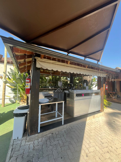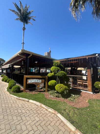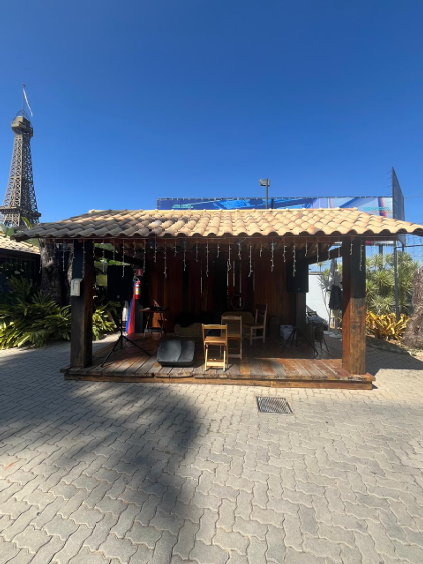4) 01 (uma) “estação” para pizzaria, em estrutura de madeira e telhado colonial; 5) 01 (uma) “estação” para acomodação de clientes, em estrutura de madeira e telhado colonial, com capacidade para 200 (duzentas) pessoas, com palco musical no fundo e escritório do lado oposto;
