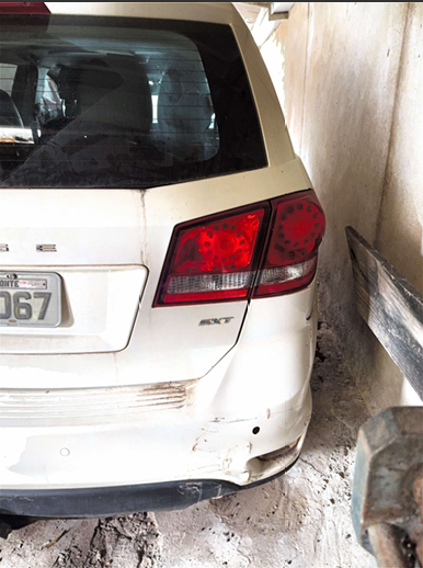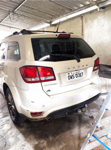 • Veículo indicado no mandado, placa OWS-0067, chassi final 10920, ano fabricação e modelo 2014, marca modelo I/Dodge Journey SXT, cor branca (dados obtidos no aplicativo Placa Fip, já que o documento não estava no veículo), com avarias, especialmente no para-choque dianteiro e traseiro, lateral traseira do lado do passageiro, pequenas avarias na pintura, pneus em razoável estado, bancos em bom estado, odômetro marcando 119.480 km. Veículo em funcionamento. Segundo a Srª. Núbia Moreira Gonçalves Soares (CPF: 052.323.206-37), há impostos em atraso.
